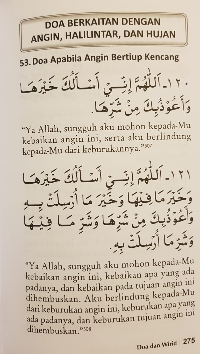 Ada panduan doa ketika hujan lebat disertai badai yang diajarkan. Artinya akan selalu ada hujan sepanjang tahun walaupun di puncak kemarau ucap Kurniaji. Ilustrasi Doa Angin Kencang.