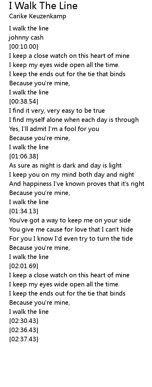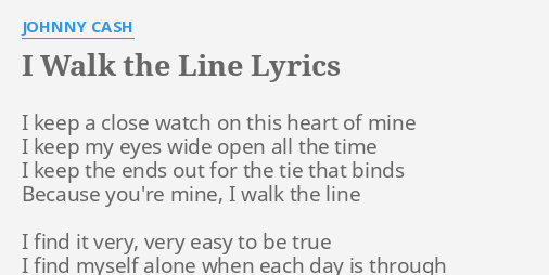 I walk the line lyrics. I keep a close watch on this heart of mine I keep my eyes wide open all the time I keep the ends out for the tie that binds Because. ----- Walk the Line - Johnny Cash ----- Tabbed by. After three attempts with moderate chart ratings it became Cashs.